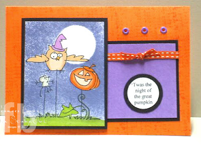 This one was for the "It's the Great Pumpkin" challenge. Ok now I am not sure what owls have to do with Charlie Brown and the great pumpkin ............. however seeing I just got this whole set of these owls and some of them are halloween and we don't do halloween in Aust ......... so if I don't use them for VSN the halloween ones mightn't get used and I want to use them! So I have decided that there was an owl there ......... if you didn't see it ....... well it is because it flew across the screen very quickly and you might have blinked and missed it .... it landed on one stacks in the pumpkin patch ..... but the camera missed that too! I think Linus is just to the left of this scene but is not shown on my card