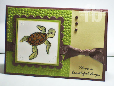I used my tiny bubbles cuttlebug embossing folder to create the background on the olive panel. The square scallop nestabilities was used for my layers to my turtle panel.