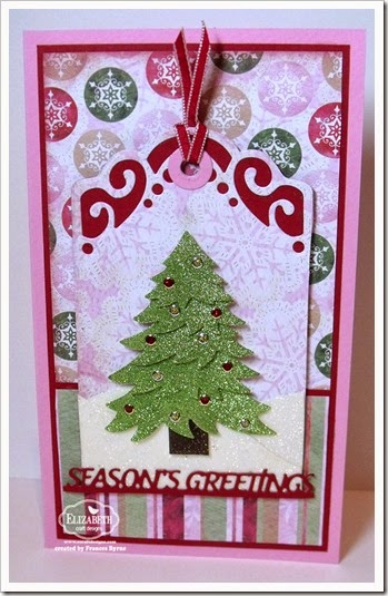 i added the 5 Part Pine which has been covered using Soft Green Silk Microfine Glitter. I added Red/Gold Glitter Dots and Gold/Silver Glitter Dots to the finished tree. Finally I added some ribbon to the top part of the tag and then layered it to a card.