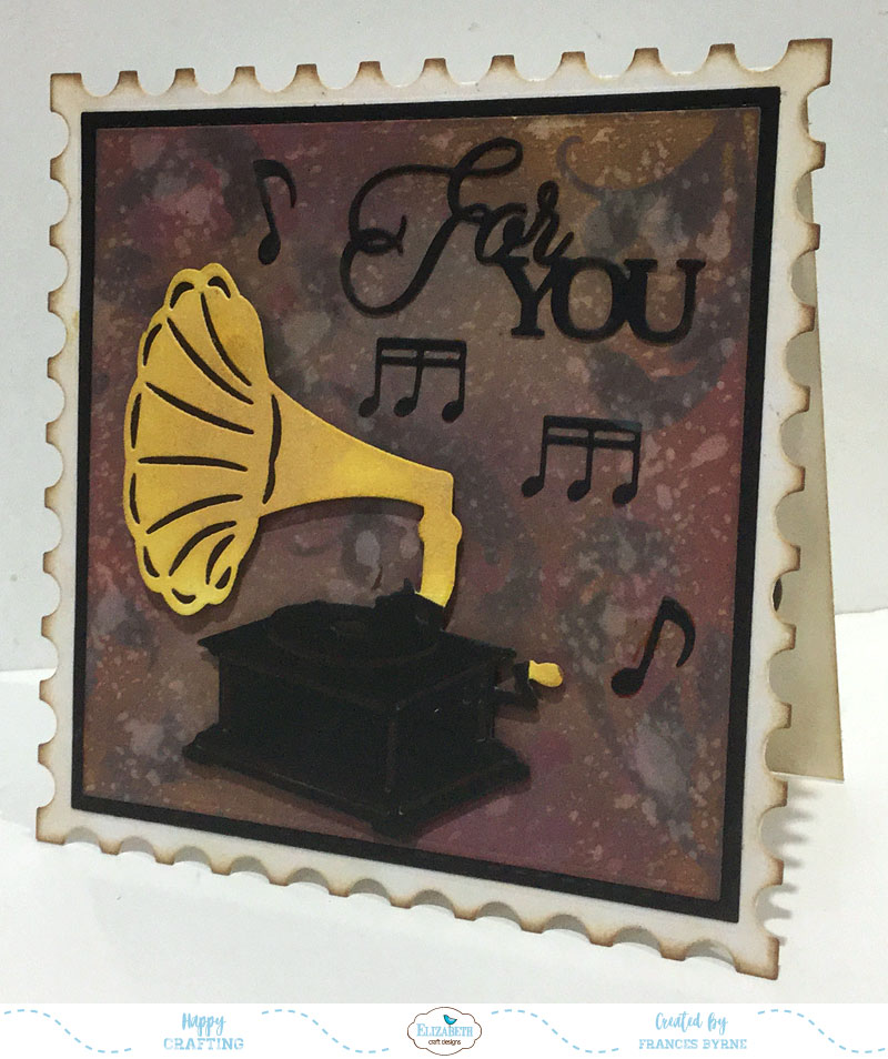 To decorate my card I used the gramophone from the Vintage Gentleman die, die cutting it from White Soft Finish Cardstock and then coloring using inks. This was adhered to the lower left hand corner of my card.