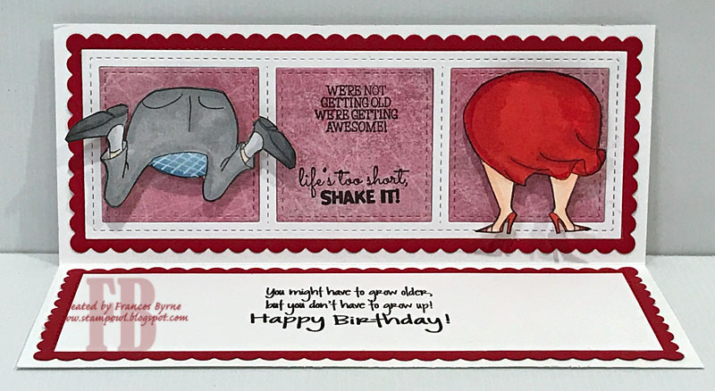 As the Shake your Booty Stamps comes with a front and back view, I couldn't let those go to waste, so I added the frame to the upper inside panel and then attached the back view to the card with action wobbles also.