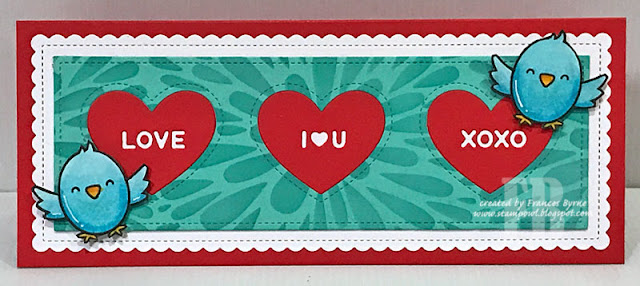 As you can see, I created a Slimline card using Lawn Fawn's new Scalloped Slimline with Hearts: Landscape die set. I die cut the heart panel from aqua & red cardstock. I used STAMPlorations Burst stencil to add some interest to the aqua panel. I layered the aqua panel onto the white scalloped panel die cut using the outer die included in the die set. This was then all layered onto a top folded red card base.