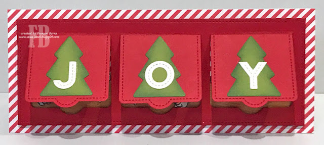I used the inner tree from the Stitched Christmas Tree Frames die set, which I added to each of the flaps and then added the letters "J O Y" to each of the trees. The letters were die cut using white glitter cardstock.