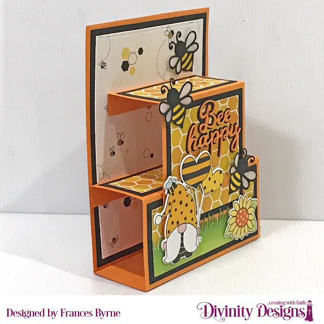 For my card today I created a Step Panel Card using the new Pop Up Card with Layers die set. The gnomes, flower and papers used to decorate this card are from the Buzzing Gnomes Paper/Die Duos set. I so love the papers included in this set, especially the gnomes that has a coordinating die included in the set so you can die cut the gnomes and accessory images included.