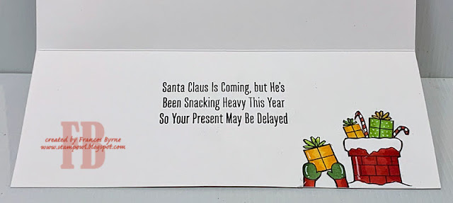 I added Santa to the chimney on the left side of the card using one of the santa stamps included in the Stuffed Santa stamp set also from MFT Stamps. The sentiment is also from this stamp set.