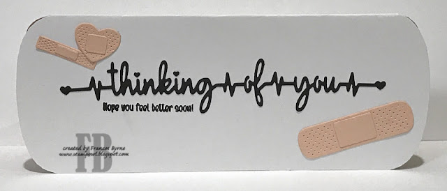 I used the Slimline Big BooBoo die set to die cut the "bandaid/plaster" shape. I adhered this onto a top folding slimline card and then trimmed around the shape, to created a shaped card. I die cut the centre of the plaster three times and layered them up for a little dimension.