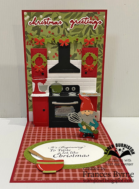 As you can see I went with a Christmas theme for my card, using the traditional red and green colour combo. I die cut the oven from the Oven Pop-up die from black cardstock to make a black oven.