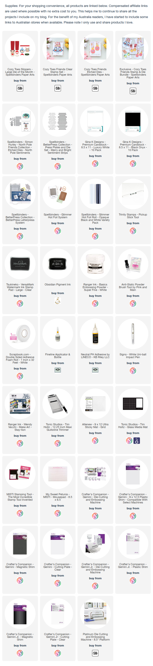 Today I am sharing three Christmas cards using Spellbinders Cozy Toes Slippers die set that was the large die of the month for October 2024. This was such a popular set that they have released a coordinating set that can be used all round. But before I use that sent I wanted to play a little more with the Christmas version.