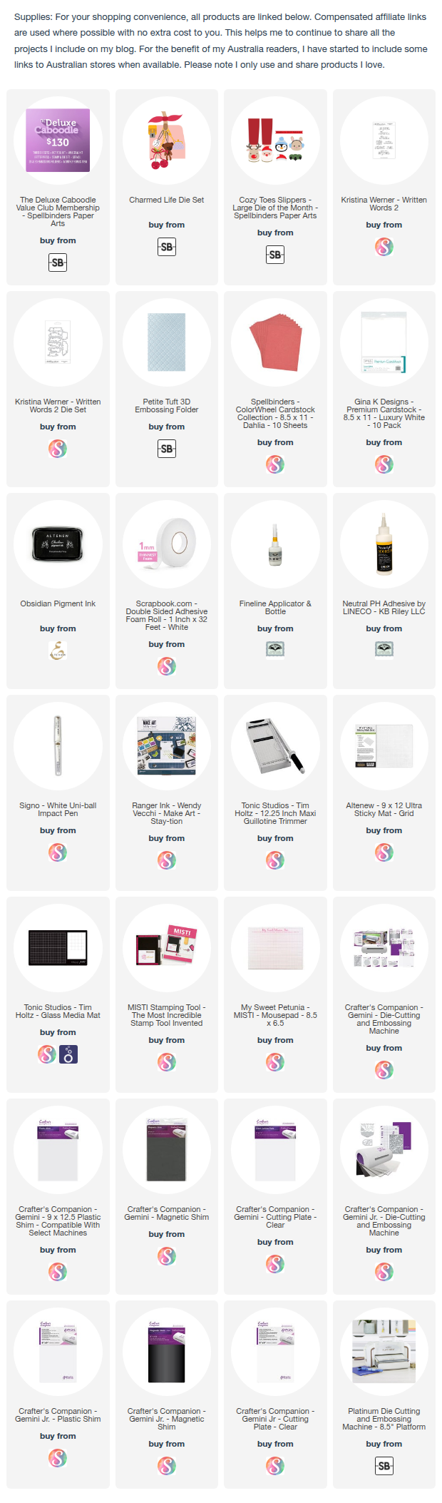 For my card I used the Large DIe of the Month for December 25 - Wrapped in love. For the background I used a 3D Embossing Folder from November 25 - Petite Tuft. I added a sentiment using Concord & 9th's Written Words 2 stamp/die set designed by Kristina Werner.