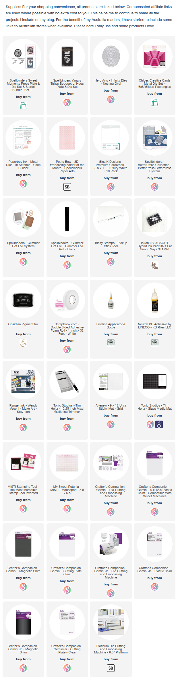 For the shape portion of the card I used Chloe’s Creative Cards Gilded Rectangles die set. Everything else on these cards uses Spellbinders products.