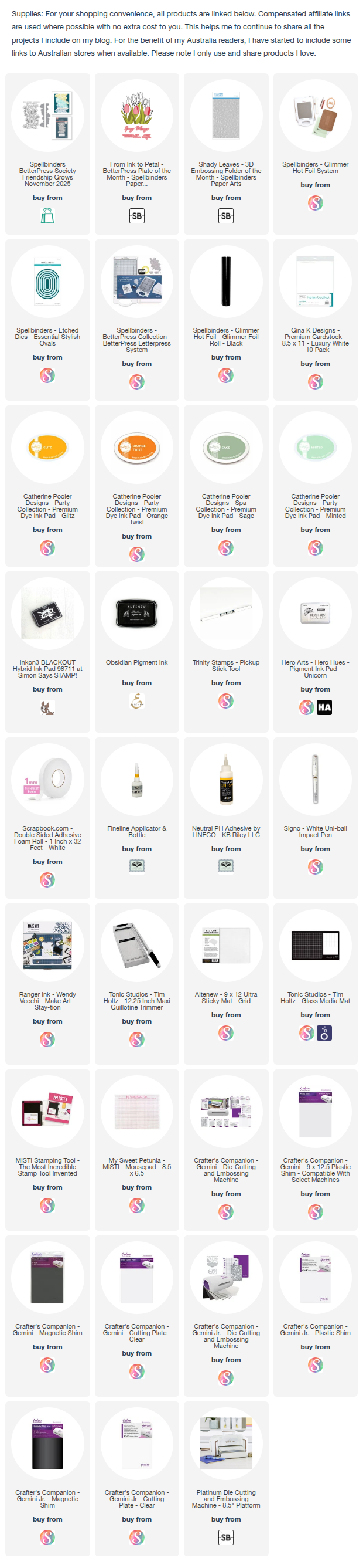 For the front of the card I used Spellbinders Friendship Grows Betterpress set which was the Betterpress Society set from November 2025. I used the included border die to cut the border along the floral image on the right side of the panel. I used black foil on the floral image.